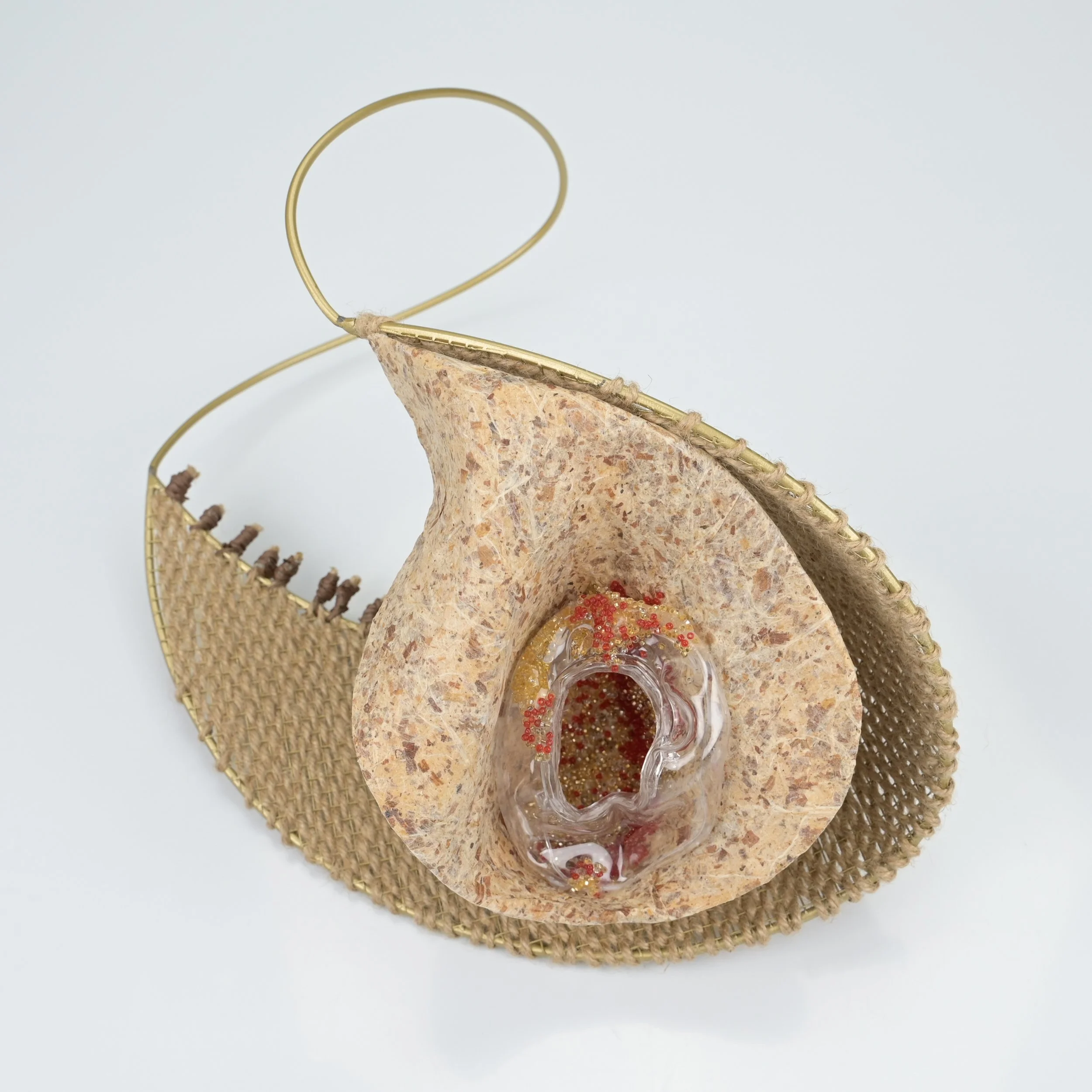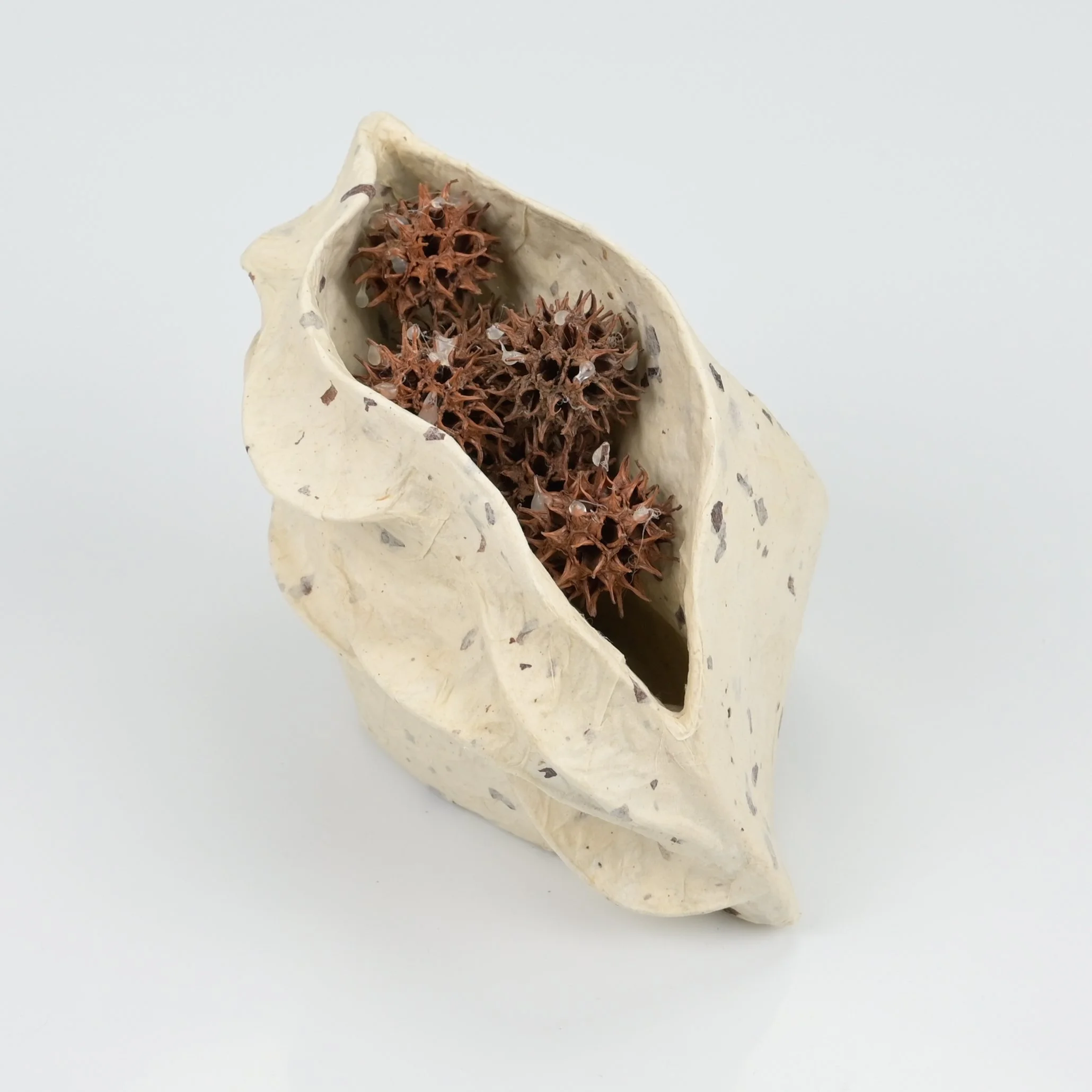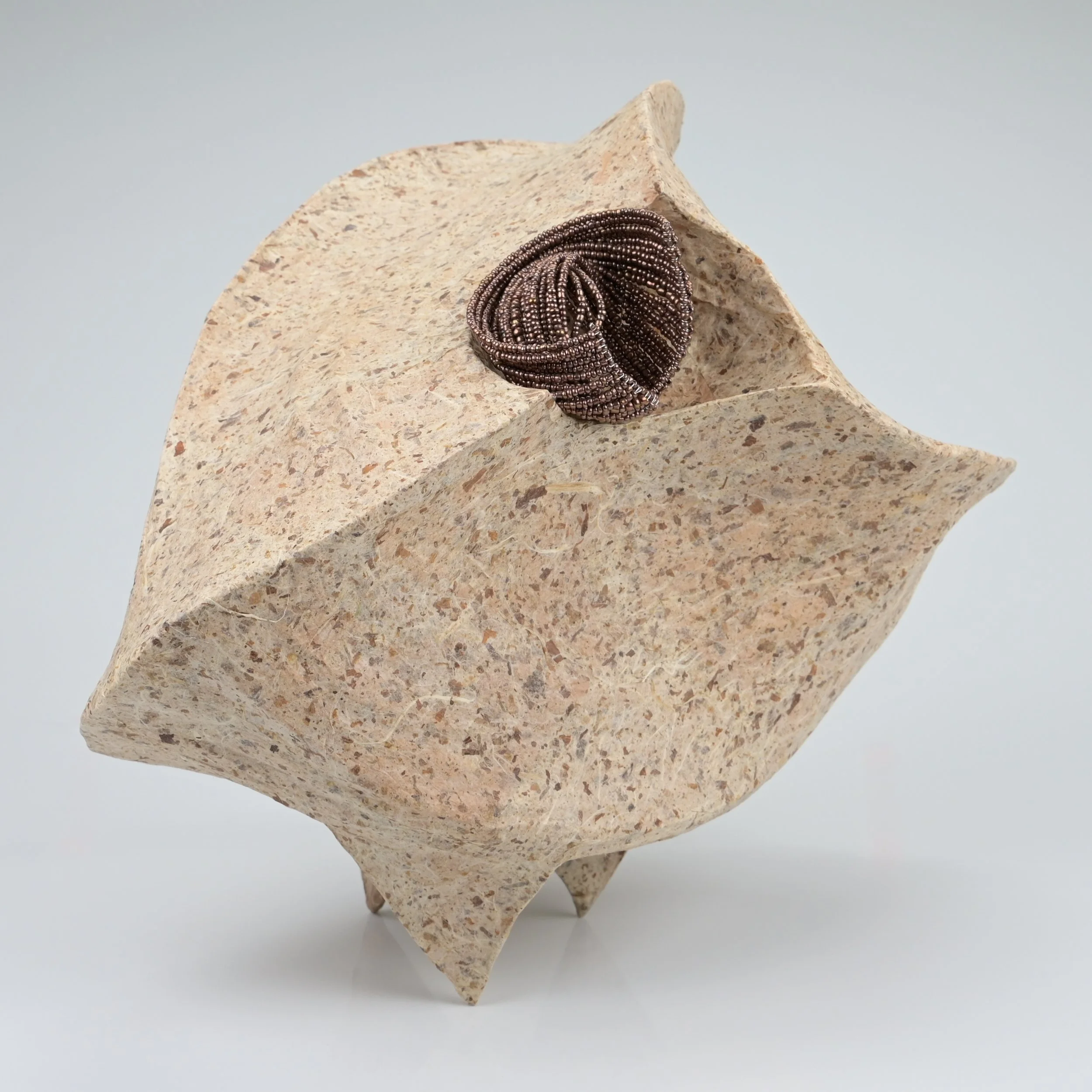 Spike pod 6” x 10” x 6” paper, wire, mixed media